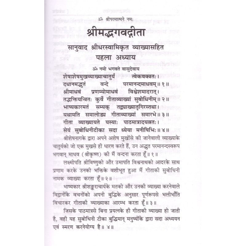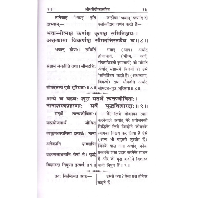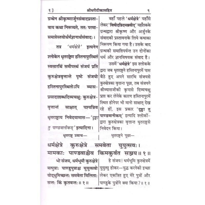 श्रीमद्भगवद्गीता भगवान श्रीकृष्ण का मानव जीवनोपयोगी दिव्य उपदेश है। इस संस्करण में श्रीमद्भगवद्गीता का अनुवाद सहित एवं श्रीधर स्वामी की व्याख्या सहित प्रकाशन किया गया है।